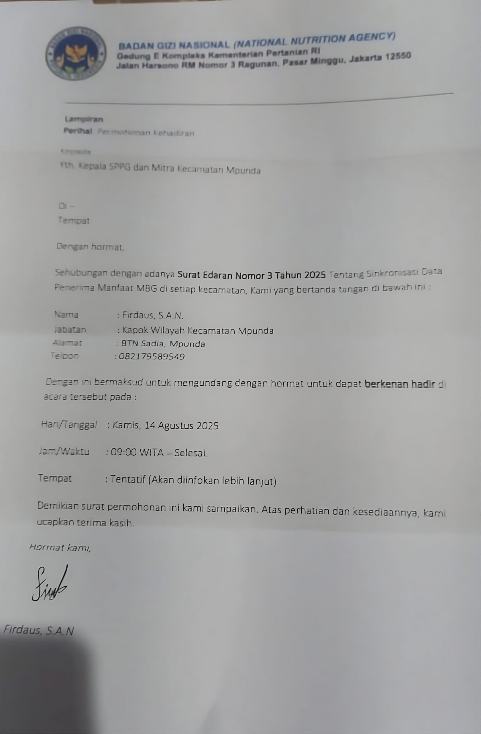 Modusnya, Firdaus masuk di Call Group WhatsApp antara Perwakilan Mitra SPPG, Perwakilan Yayasan dan Kepala SPPG Sadia Mpunda yang sedang mengklarifikasi undangan yang di kirimkan via WhatsApp kepada kepala SPPG, dan dialam percakapan yang sedang berlangsung tersebut, SPPI An. Firdaus mengundang kembali, dan dengan Nada sedikit memaksa kepada Perwakilan Mitra SPPG untuk hadir dalam pertemuan yang ia adakan. Ketika perwakilan mitra menanyakan kapasitasnya mengundang dan tujuan pertemuan, Firdaus mengaku membantu Korwil dan selain itu justru mengeluarkan kalimat ancaman: