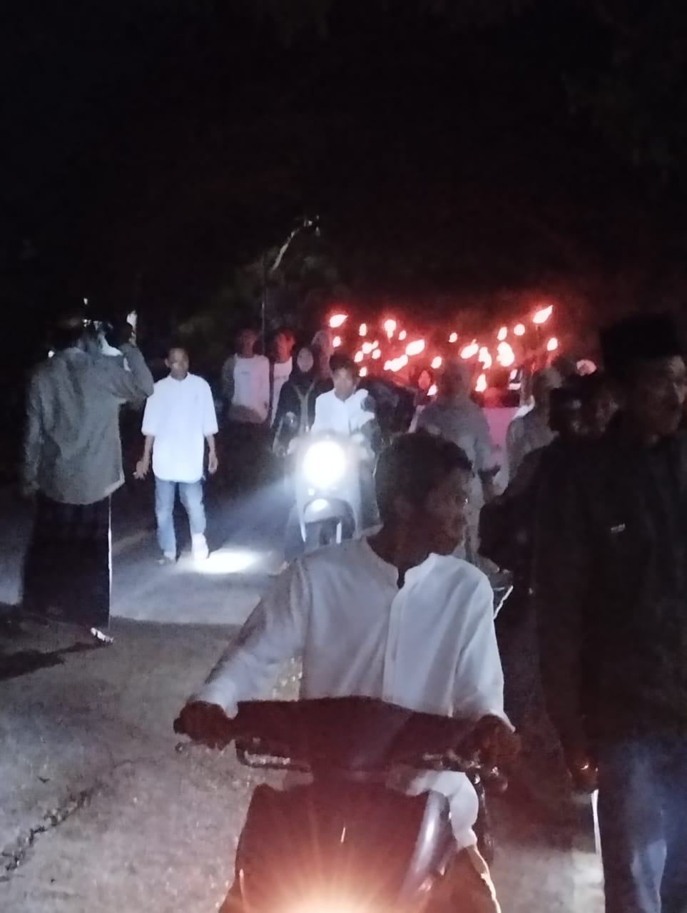Ratusan warga dari berbagai kalangan, mulai dari anak-anak, remaja hingga orang dewasa, turut ambil bagian dalam pawai tersebut. Mereka berjalan beriringan menyusuri jalan-jalan desa sambil membawa obor yang menyala, menciptakan suasana hangat dan penuh kebersamaan di malam hari.